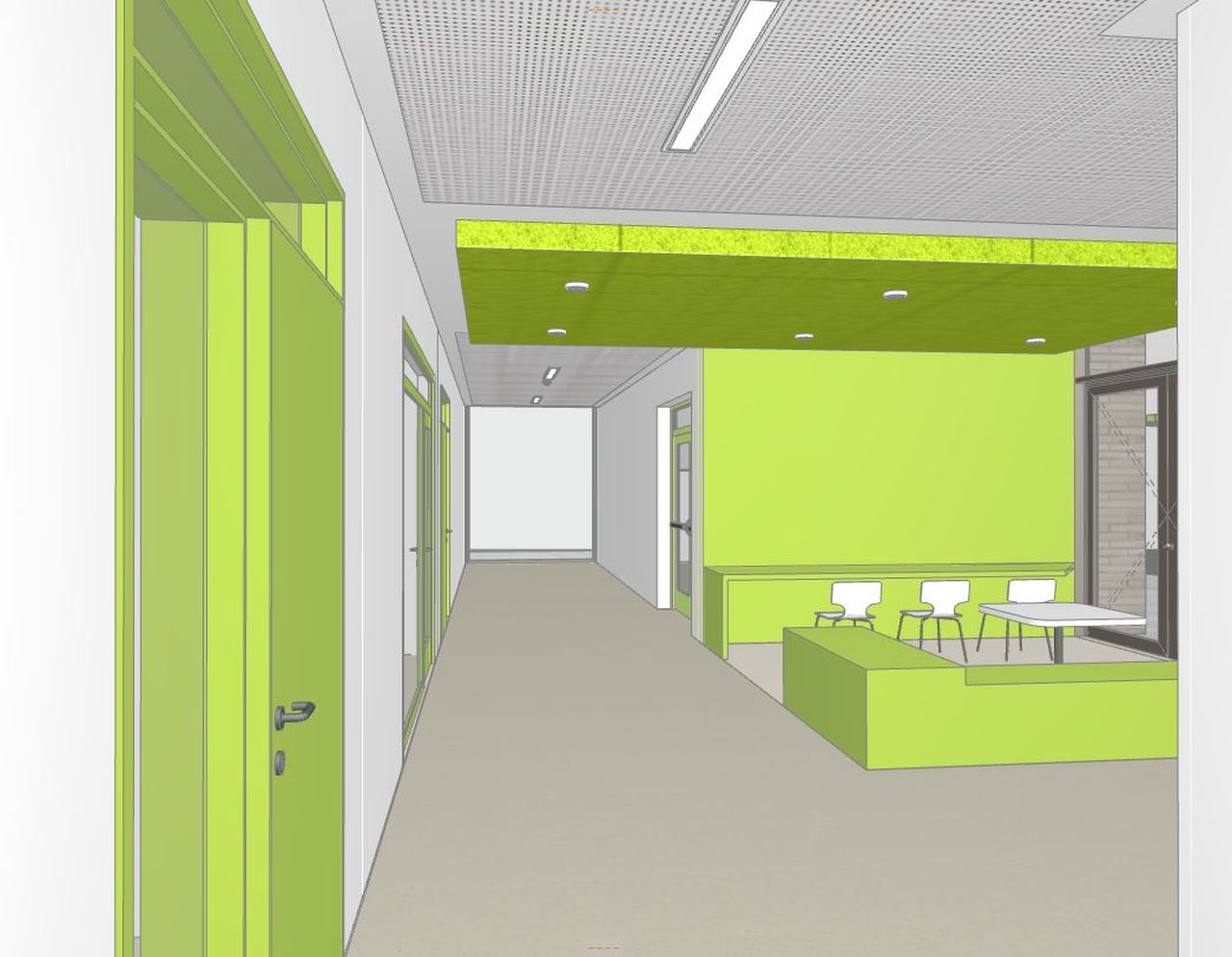 Sanierung des Bauteils A (Altbau). Neben der Erneuerung aller technischen Versorgungsleitungen werden die Musikräume, die Aula und die Klassenräume modernisiert, der Verwaltungstrakt neu geordnet sowie die Schülerbücherei und die Räume der Schulsozialarbeit neu konzipiert.